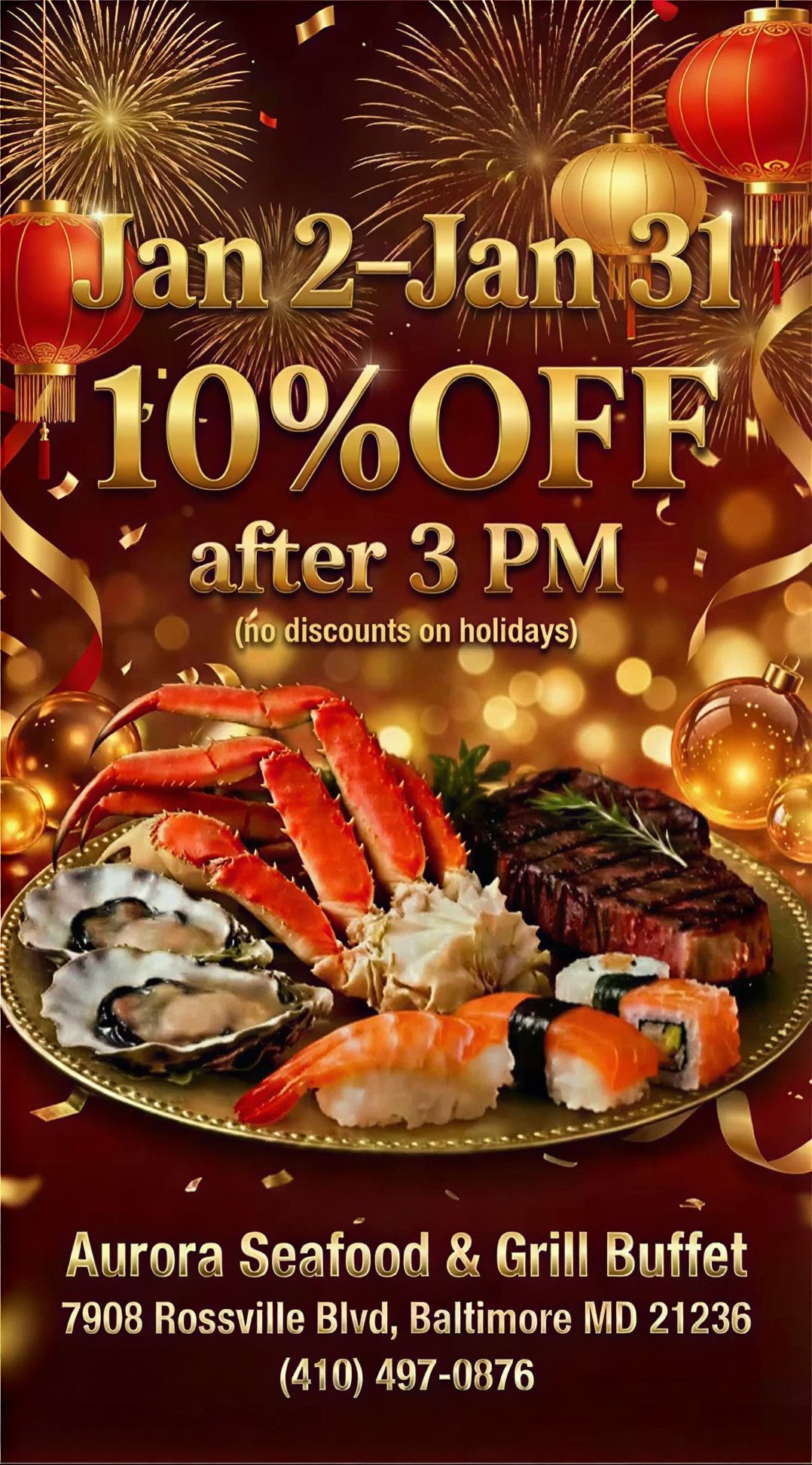 - Aurora Seafood & Grill Buffet is a family-friendly all-you-can-eat destination in Baltimore, MD.
